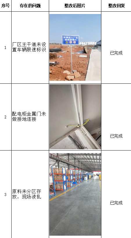 發現的問題及安全對策措施 | 江西沃爾肯智能裝備科技有限公司針對評價組提出的上述問題,認真研究對策措施,制定整改計劃,切實落實整改措施,項目評價過程中發現的安全隱患已基本整改到位,整改情況如下表: