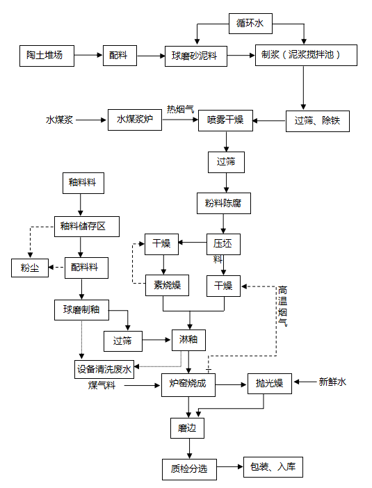 本項目主要生產設備、設施見表2.5-1,特種設備見表2.5-2。 表2.5-1 主要生產設備、設施一覽表 工序/線序號設備位置設備名稱規格和型號單位數量備注制釉線1車間1樓球磨機YE3-280-6 55KW(5T)臺14 2車間1樓球磨機YE2-250M-6 37KW(3T)臺1 3車間1樓球磨機YE2-180M-6 15KW(1.5T)臺1 42樓平臺上攪拌機WSS 3.7KW臺24 5釉線平臺上攪拌機WSS 3KW臺12 6車間1樓振動篩YZUL-15-2 1.1KW(1米)臺2 7車間1樓振動篩YZUL-15-2 1.5KW(2米)臺21 82樓平臺上電動葫蘆2.8T 8KW臺2 9車間1樓自動除鐵機1.8萬磁 3kw臺2 平臺線1出磚線下磚機順發單邊上下磚機 8kw臺6 2出磚線干式切割機蘭科 XTQ-4 8KW臺1 3素出磚平臺傳動電機YE2-802-4 0.75KW臺50 4釉出磚傳動電機YE2-802-4 0.75KW臺99 5素長平臺傳動電機YE2-802-4 1.1KW臺58 6釉長平臺傳動電機YE2-802-4 1.1KW臺47 7素、釉平臺自動分線機 臺2 煤氣站1主樓煤氣發生爐4.6m臺2一期二線建1臺2主樓1樓工藝風機TEV2-315S-2 110KW臺4 3加壓房加壓機YBX3-315L-2 160KW臺3 4煤場喂料機40T 4KW臺1 5煤場除塵機YE2-315M-4 132KW臺1 6煤場輸送帶YE3-112M-4 3KW臺5 7煤場YE3-112M-4 4KW臺7 8煤場YE3-112M-4 5.5KW臺3 9主樓YE3-112M-4 4KW臺2 10煤場滾筒篩YE3-160M-4 7.5KW臺1 施釉線1入磚線下磚機順發單邊上下磚機 8kw臺6 2施釉車間轉坯機1000mm 0.75kw套24 3施釉車間傳動電機YE2-802-4 0.75KW臺360 4施釉車間傳動電機YE2-802-4 0.55KW臺15 5噴墨房噴墨機TQ*325-4-SC(2)+MC(2)-19042705 14kw臺6 7施釉車間毛刷機800mm臺6 8施釉車間振動篩YZUL-15-2 0.75KW(800mm)臺14 9施釉車間加熱器220V 4.5kw臺38 10施釉車間除塵機YE3-280M-4 75KW臺1 11施釉車間高腳泵YE2-802-4 0.75KW臺14 12施釉車間吹風機YE2-802-4 0.75KW臺52 13施釉車間吹塵機YE2-802-4 1.5KW臺6 機電機修1馬路邊脫硫塔莫森環保套1 2脫硫塔循環泵YE2-315L-4 185KW臺2 3脫硫塔螺旋風機YE2-200L-4 30KW臺2 4脫硫塔循環池攪拌YE3-160L-4 15KW臺1 5脫硫塔抽石灰渣電機YE3-132S1-2 5.5KW臺2 6脫硫塔加藥泵YE3-100L2-4 3KW臺2 7脫硫塔工藝泵YE3-160L-2 18.5KW臺2 8脫硫塔過濾泵電機YE3-132S1-2 5.5KW臺2 9脫硫塔制藥攪拌機YE3-100L2-4 3KW臺1 10脫硫塔螺旋輸送電機YE2-180M-4 18.5KW臺1 11脫硫塔過濾池攪拌機YE3-112M-4 4KW臺1 12空壓機房空氣壓縮機BMF75-811 55KW臺4 窯爐線1釉燒窯排潮風機YE2-280S-4 75KW臺2 2釉燒窯一級排煙風機YE2-355M-4 250KW臺2 3釉燒窯二級排煙風機YE2-315S-4 110KW臺2 4釉燒窯一級助燃風機YE2-280M-2 90KW臺2 5釉燒窯二級助燃風機YE2-280S-2 75KW臺2 6釉燒窯急冷風機YE2-280S-2 75KW臺3 7釉燒窯抽熱風機YE2-315L2-4 200KW臺2 8釉燒窯直冷風機YE2-280S-2 75KW臺2 9釉燒窯尾冷風機YE2-280S-6 45KW臺1 10釉燒窯傳動電機NCJF04Y-Y90L4-1.5-23 1.5KW臺135 11素燒窯排潮風機YE2-315L-4 185KW臺2 12素燒窯一級排煙風機YE2-355M-4 250KW臺2 13素燒窯二級排煙風機YE2-315S-4 110KW臺2 14素燒窯一級助燃風機YE2-280M-2 90KW臺2 15素燒窯二級助燃風機YE2-280S-2 75KW臺2 16素燒窯急冷風機YE2-280S-2 75KW臺3 17素燒窯抽熱風機YE2-315L2-4 200KW臺2 18素燒窯直冷風機YE2-280S-2 75KW臺2 19素燒窯尾冷風機YE2-280S-6 45KW臺1 20素燒窯傳動電機NCJF04Y-Y90L4-1.5-23 1.5KW臺100 21素燒干燥窯傳動電機NCJF04Y-Y90L4-1.5-43 1.5KW臺60 22脫硫管線引風機YE3-355L3-6 315KW臺1 分選線1檢選車間磨邊機800mm 115KW臺12 2檢選車間除塵機YE2-280M-4 90KW臺1 3檢選車間YE2-280S-4 75KW臺1 4檢選車間覆膜機蘭科立輝機電SKT-800 3KW臺6 5檢選車間自動打包機多麥 8KW臺6 6檢選車間手動打包機MH-101A 1KW臺2 7檢選車間自動碼垛機多麥 8KW臺6 8檢選車間疊磚機10KW臺6 9檢選車間柱塞泵YE2-180L-4 22KW臺2 壓機線1壓機車間薩克米壓機PHC3500 100KW臺6 2壓機車間料車明協400*800 3kw臺6 3壓機車間除塵器YX3-315M-4 132KW臺1 4壓機車間翻坯器YS7124 3KW臺6 5壓機車間磨坯機1000mm 2.2kw臺6 6平臺連接線傳動電機YE2-802-4 0.75KW臺122 7壓機車間送粉輸送帶YE3-112M-4 3KW臺20 8壓機車間YE3-112M-4 4KW臺4 9壓機車間YE3-132M-4 5.5KW臺2 備料線1噴霧塔噴霧塔12000型臺1 2噴霧塔風機YE2-400L1-6 400KW臺1 3噴霧塔振動篩YZUL-15-2 1.5KW臺12 4噴霧塔柱塞泵YE2-180L-4 22KW臺1 5噴霧塔柱塞泵YE2-200L-4 30KW臺2 6噴霧塔華巖泵YE2-280S-2 75KW臺2 7噴霧塔華巖泵YE2-160M-2 11KW臺2 8噴霧塔輸送帶YX3-90L-4F2A 1.5KW臺5 9噴霧塔YE3-112M-4 3KW臺1 10噴霧塔YE3-112M-4 4KW臺9 11噴霧塔YE3-132M-4 5.5KW臺1 12噴霧塔攪拌機YE2-132M-4 5.5KW臺6 13噴霧塔水煤漿爐9M臺1 14球磨車間水煤漿車間球磨機60噸 YE3-355M-4 250KW套10 1560噸 YE3-315M2-4 200KW套4 16球磨車間柱塞泵YE2-200L-4 30KW臺3 17球磨車間振動篩YZUL-15-2 1.5KW臺15 18球磨車間喂料機25噸 4KW臺2 19球磨車間除鐵機自動 3KW臺6 20球磨車間攪拌機YE2-132M-4 5.5KW臺6 21球磨車間YE2-132M-4 7.5KW臺7 22球磨車間YE2-180L-8 11KW臺2 23球磨車間輸送帶YX3-100L1-4 2.2KW臺4 24球磨車間YE3-112M-4 4KW臺6 25球磨車間YE3-132M-4 5.5KW臺6 26水煤漿球磨柱塞泵YE2-200L-4 30KW臺2 27水煤漿球磨振動篩YZUL-15-2 1.5KW臺5 28水煤漿球磨攪拌機YE2-132M-4 7.5KW臺2 29水煤漿球磨輸送帶YE3-112M-4 3KW臺2 30水煤漿球磨YE3-112M-4 4KW臺4表2.5-2 特種設備一覽表 序號工序/線設備位置設備名稱規格和型號單位數量功率(kw)1制釉線2樓平臺上電動葫蘆2.8T 8KW臺2162機電機修空壓機房空氣儲罐BMF75-811 55KW臺42203煤氣站/煤氣發生爐汽包、水夾套及其管道φ4.6m/0.8MPa臺2 4制釉、檢選、倉庫/叉車(柴油)3T臺6廠區電源由萬年縣供電公司鳳巢工業園區專用110KV/10KV輸變電工程供應,采用埋地敷設至廠區變電房內。 本工程設置1臺額定功率1000kW柴油發電機以滿足二級用電負荷的可靠性,額定電壓為400V,設置于變電房東側的發電機房內。柴
